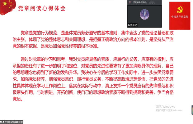 兰佳忆同志在为大家分享完阅读党章的心得体会后并发言:“今天的活动,让我们重温了红色经典和党的百年历程。作为一名党员,我会加强党史学习,更加坚定自己的理想信念,牢记初心使命,更好地开展工作。”