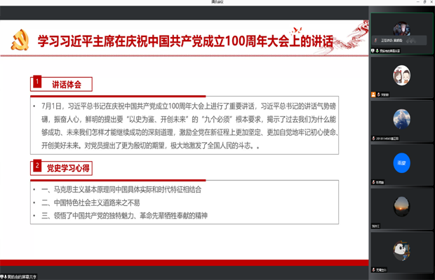 本次活动的主要内容为学习习近平主席在庆祝中国共产党成立100周年大会上的讲话并以党史领学小组为单位分享体会和心得。