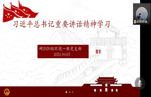 2021年10月3日星期日晚上九点,研20级环境一班党支部通过腾讯会议开展了线上组织生活会,主要内容为:学习习近平总书记在中国科公司第二十次院士大会、中国工程院第十五次院士大会、中国科协第十次全国代表大会上的讲话精神以及给《文史哲》编辑部全体编辑人员回信精神。本次组织生活会由研20级环境一班党支部书记李佳琪主持,研20级环境一班党支部全体党员、发展对象、积极分子参加。