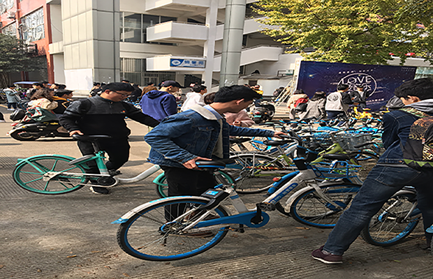 紧接着。我们进入本次活动的第二项即为师生做一件好事。这是我们党员的责任与义务。三个支部的同志一同到公司四食堂门口为同学们整理摆放好共享单车。为校园的整洁和同学们的便利奉献一份力量。