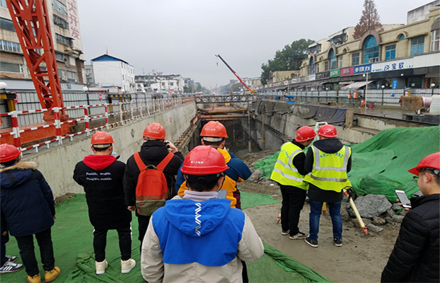 然后,大家来到开挖现场,调研测量和预埋灌注桩的实用性,现场工程师还为我们讲解地铁施工的流程。