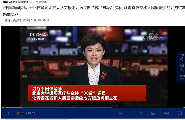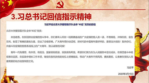 接着,谢奇材同志给我们分享了北京大学人民医院的“90后”护士李嘉茵和武汉中医医院的放射科的多位“90后”医师在抗疫中的事迹,并发表了自己的看法。他认为“90后”在此次疫情中发挥着重要的作用,“90后”已经蜕变成长。我们作为党员同志要学习他们不怕苦不怕累,为人民服务的精神外,并且要充分发挥党员的带头作用。接着,谢奇材同志通过图文和视频带领我们学习:习近平总书记给北京大学援鄂医疗全体“90后”党员回信的重要内容。