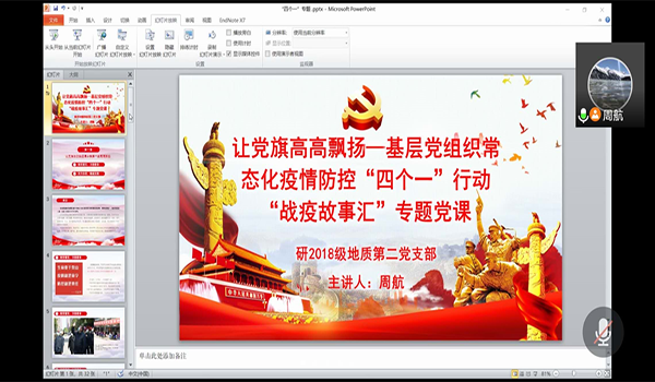 2020年7月7日,研2018级地质第二党支部在腾讯会议开展了“战疫故事汇”专题党课活动,两名党员请假,其余全体党员和入党积极分子全体参加,会议由周航同志主持。