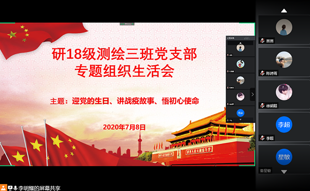 2020年7月8日下午3点,必赢76net线路官网研18级测绘三班党支部通过网络会议的形式开展了“四个一”行动中的“一次专题组织生活会”。会议的主题是“迎党的生日、讲战疫故事、悟初心使命”。