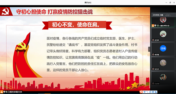 本次会议主要有两方面内容,第一个PPT向大家展现了抗疫情战役中的典型英雄故事,他们中有年过古稀本该颐养天年的老人,有无私奉献的白衣天使,有守护平安的公安民警,更有日夜奔波于乡村一线的基层干部……他们职业不一却信仰相通,他们有着共同的名字——共产党员。当病毒肆虐、举国抗击的关键时期,有一个群体,他们主动请缨,奋战于抗击疫情一线,用行动践行了“随时准备为党和人民牺牲一切”的初心和誓言。