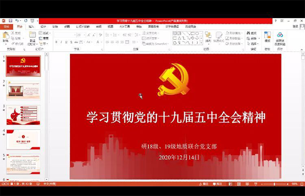 2020年12月14日晚上7:00,研18级地质一、二班党支部在巫锡勇老师的带领下一起学习了党的十九届五中全会精神。由于疫情原因,本次会议在线上进行。