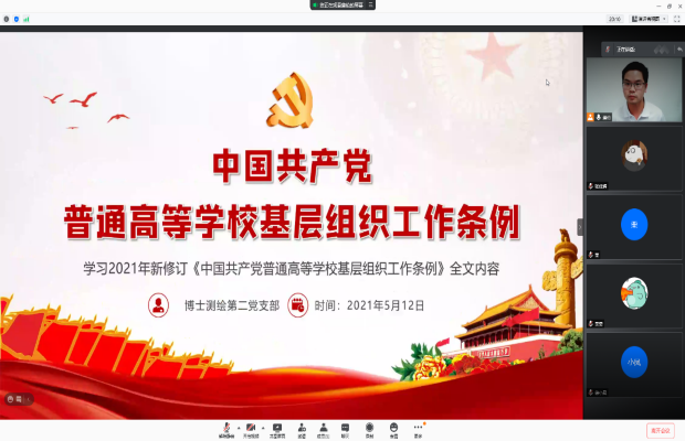 为以高质量的党建工作引领推动公司的国际化示范公司建设,全面规范院内基层党组织的建设,必赢76net线路官网博士测绘第二党支部于2021年5月12日晚20:30在腾讯会议(会议ID:972 655 275)开展了《中国共产党普通高等公司基层组织工作条例》(以下简称《条例》)集中学习活动。本次学习活动由支部书记蒲伦主持,支部内全部党员和入党积极分子参加。