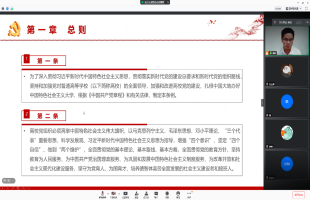 以《条例》为学习框架,支部全体成员结合博士生党员的实际情况深入学习了高公司党组织工作应当遵循原则,例如,坚持高公司党的建设与人才培养、科学研究、社会服务、文化传承创新、国际交流合作等深度融合,为高校改革发展稳定、完成党和国家重大战略任务提供思想保证、政治保证、组织保证。这些都与博士生党员紧密相关,有必要对这方面有深刻的认识和深入的了解。