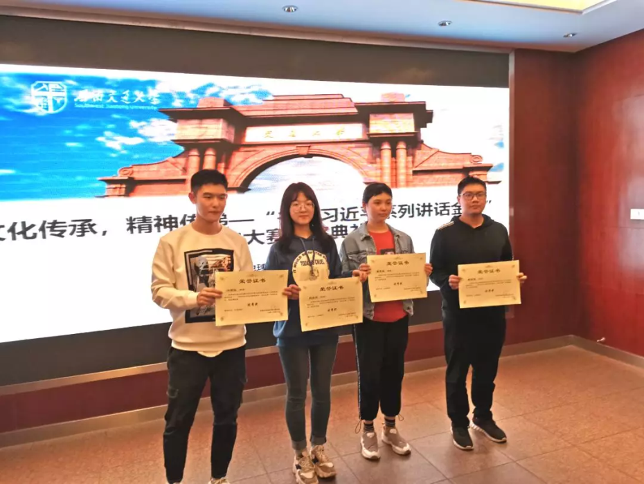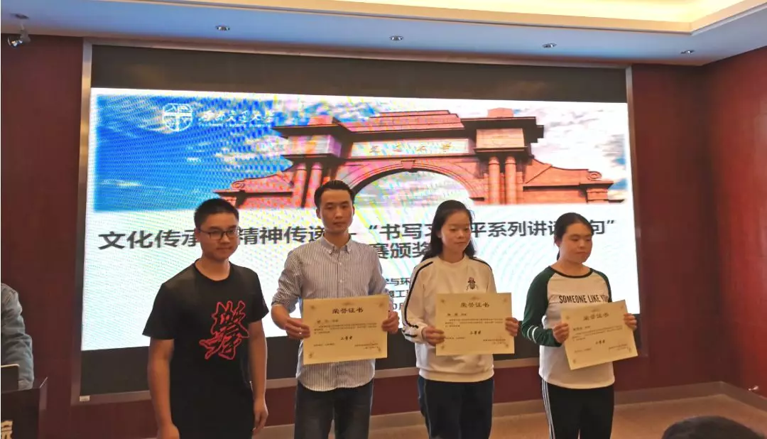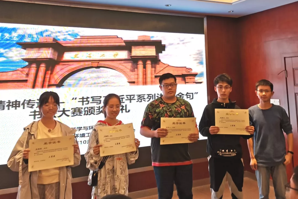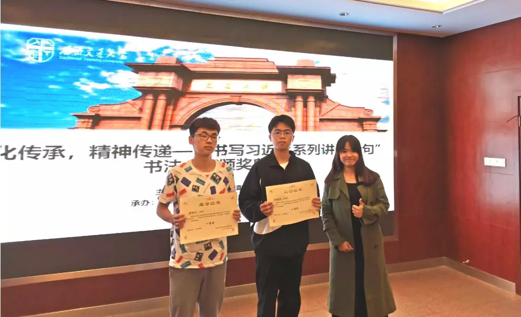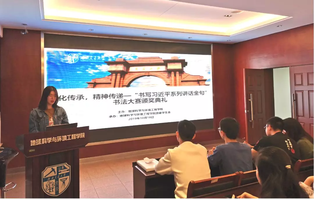 10月18日晚19:30,“文化传承,精神传递”书写习近平系列讲话金句书法大赛颁奖典礼在X4520举行。出席嘉宾有:员工会指导老师李国欣,地学员工会主席严榆凡,副主席潘越,副主席黄镜。
