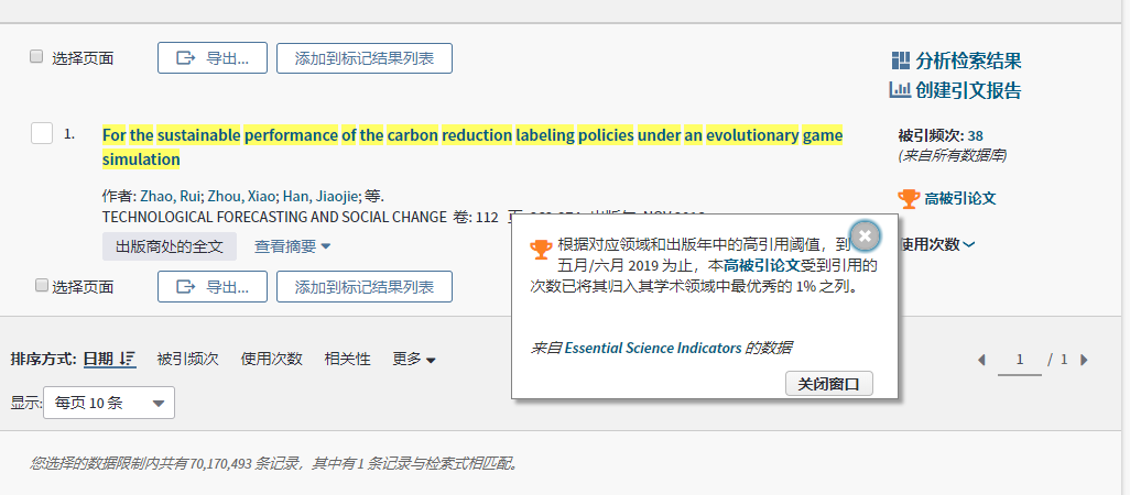 carbon reduction labeling policies under an evolutionary game simulation”被引次数进入经济学与商学学科全球前1%,被ESI高被引论文(Highly Cited Papers)收录。该论文发表在SSCI检索期刊“TECHNOLOGICAL FORECASTING AND SOCIAL