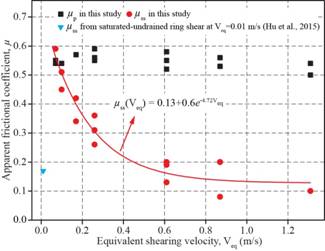 图2 滑坡底部相试样等效摩擦系数之速度相依弱化特性