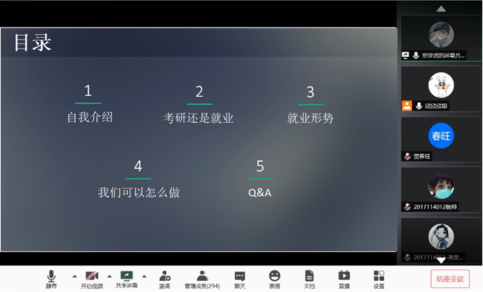 之后,董浩老师分析了当前受疫情影响下企业招聘需求下降、应届毕业生岗位减少的具体形势。然后,顺势讲述了国家与公司针对目前形势拓宽就业渠道的措施的概括,以及提供就业服务的国家方针策略,并总结出了“工作不难找,好工作要趁早”的结论。